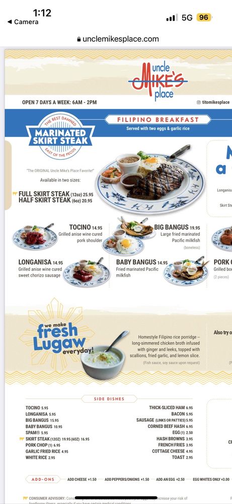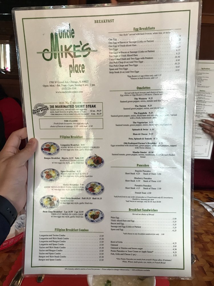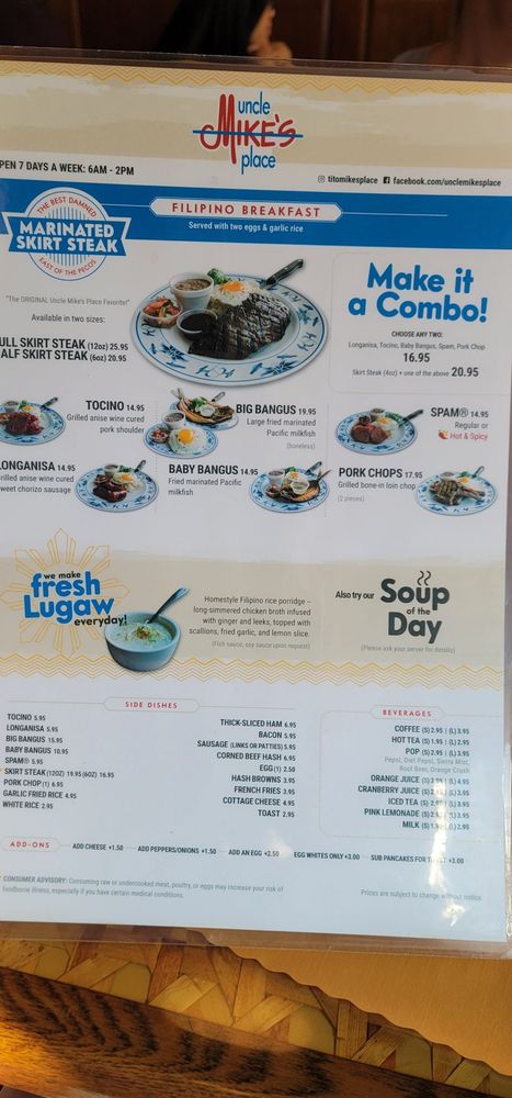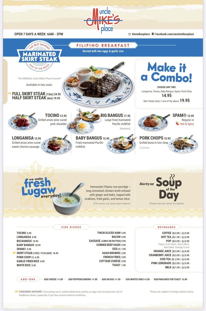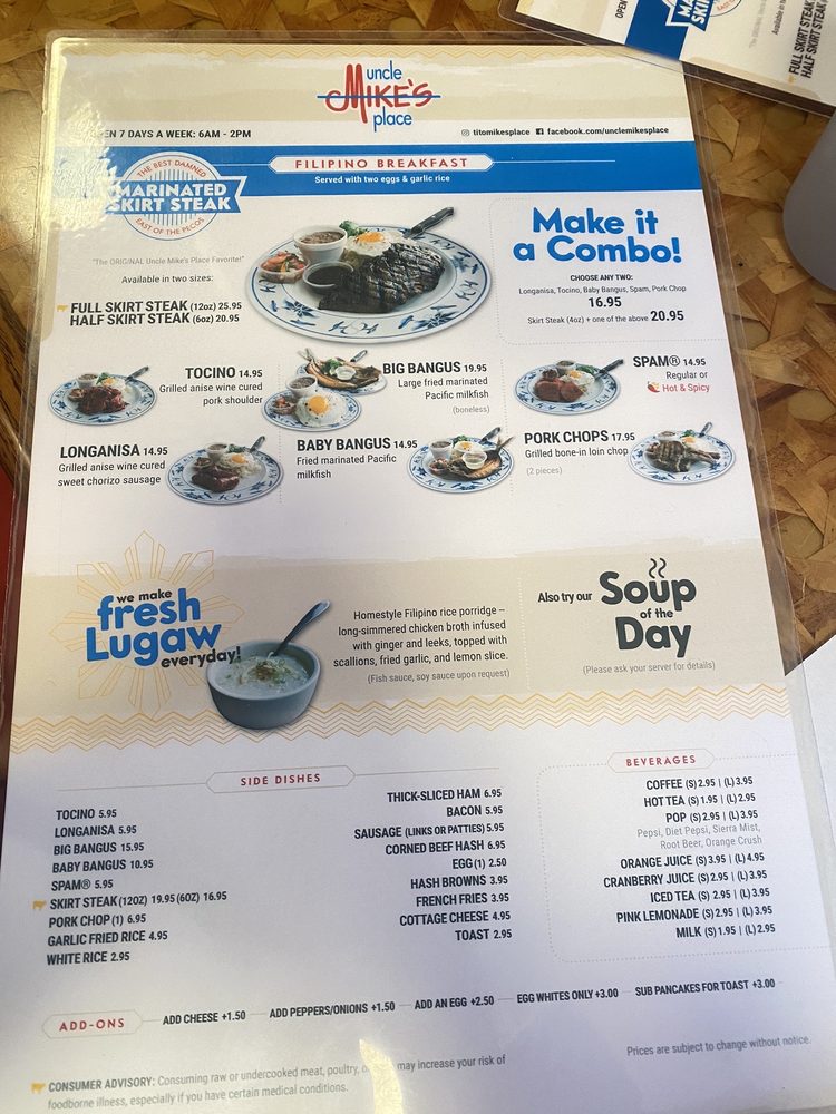 Welcome to Uncle Mike's Place, a Filipino-American breakfast and brunch spot located in Chicago. This cozy restaurant offers delivery, takeout, and even has vegan options available. The menu features delicious dishes like the famous Marinated Skirt Steak and various Filipino breakfast combos, including Longanisa and Tocino Combo and Tocino and Spam Combo. Customers rave about the friendly staff, complimentary lugaw, and authentic flavors in dishes like Bangus and Champorado. The waitlist system with QR codes keeps things running smoothly, and the hearty portions ensure a satisfying dining experience. The restaurant's homey atmosphere and efficient service make Uncle Mike's Place a must-visit for those craving a taste of Filipino comfort food with a unique twist. Don't miss out on the lugaw and champorado, they're sure to leave you craving more. Plan your visit today to experience the best of Filipino-American fusion cuisine at Uncle Mike's Place.